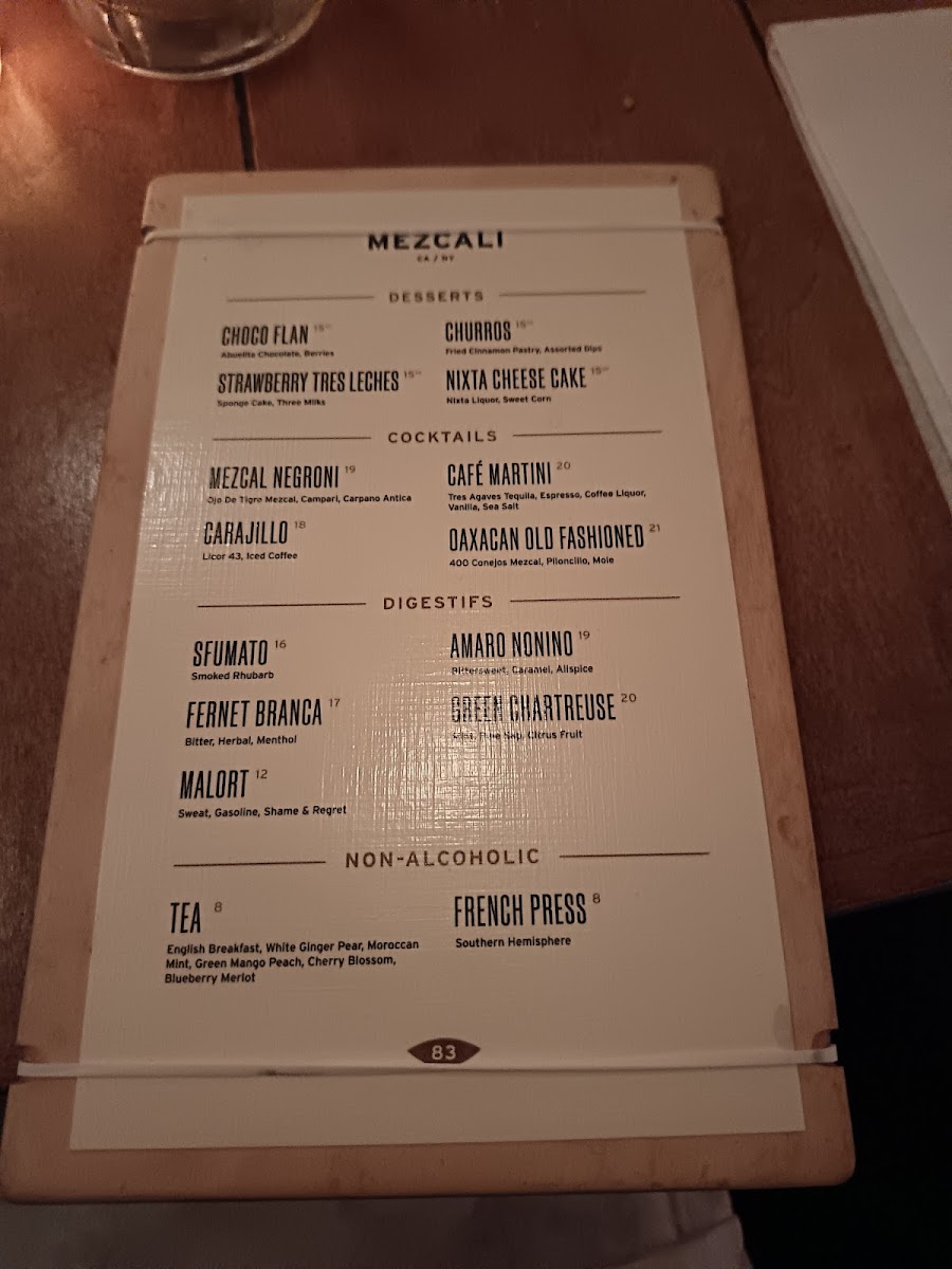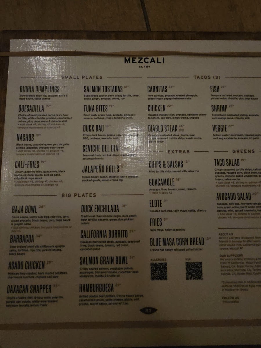 Mezcali, nestled in the heart of New York City, offers an expertly crafted Mexican menu that strikes a perfect balance between tradition and innovation. The small plates, such as Crab Empanadas filled with jumbo lump crab and gulf shrimp, paired with a smoky fresno chili dip, set the tone for a vibrant dining experience. Freshness shines in the Tuna Tostadas, showcasing sushi-grade tuna atop a crispy pressed corn base with yuzu kosho and pickled onions, highlighting coastal Mexican flavors infused with subtle Asian notes.